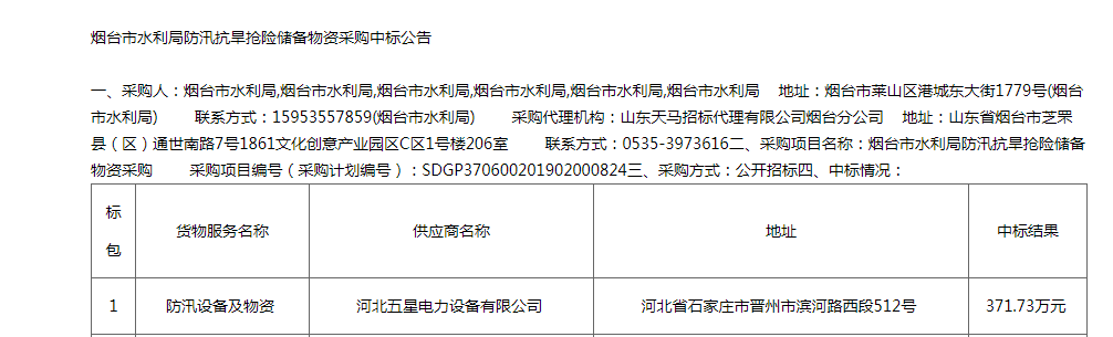 熱烈祝賀河北五星煙臺(tái)市水利局防汛抗旱搶險(xiǎn)儲(chǔ)備物資采購(gòu)一舉中標(biāo)!